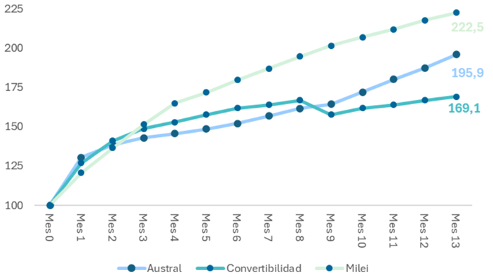 Además, mientras que en la Convertibilidad la inflación se estabilizó por debajo del 2% mensual durante el primer año, el Plan Motosierra no logró perforar el piso de los dos dígitos mensuales en los primeros cuatro meses de aplicación, con tasas de inflación cercanas al 13% en enero, 15% en febrero y 11% en marzo. En este sentido, la supuesta eficacia del plan en bajar la inflación se relativiza cuando se observa el ritmo acumulado y su impacto estructural, ya que el grueso del ajuste se trasladó a los precios minoristas sin mecanismos de coordinación institucional o amortiguación social.